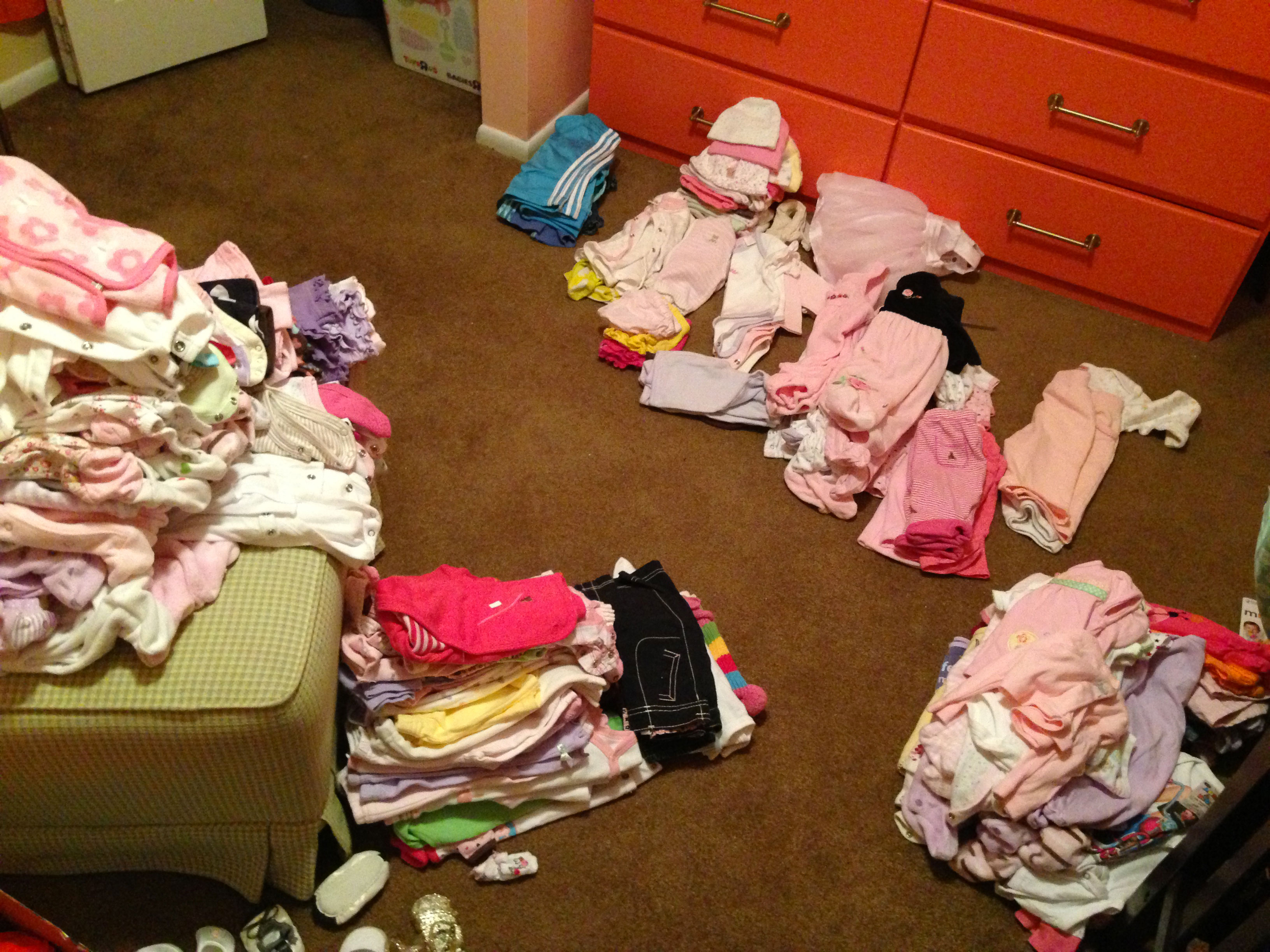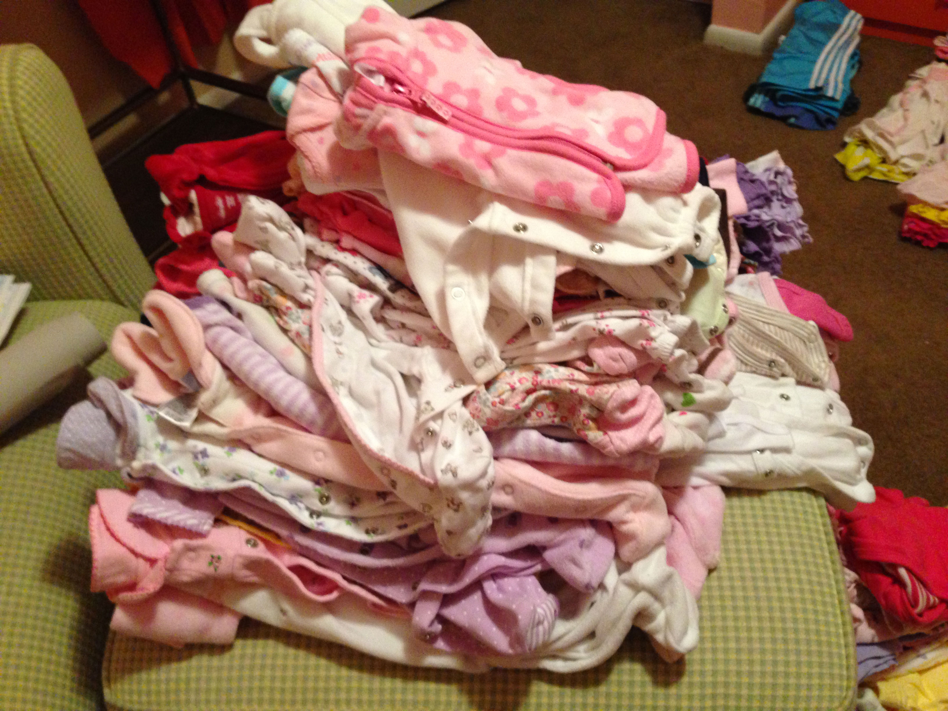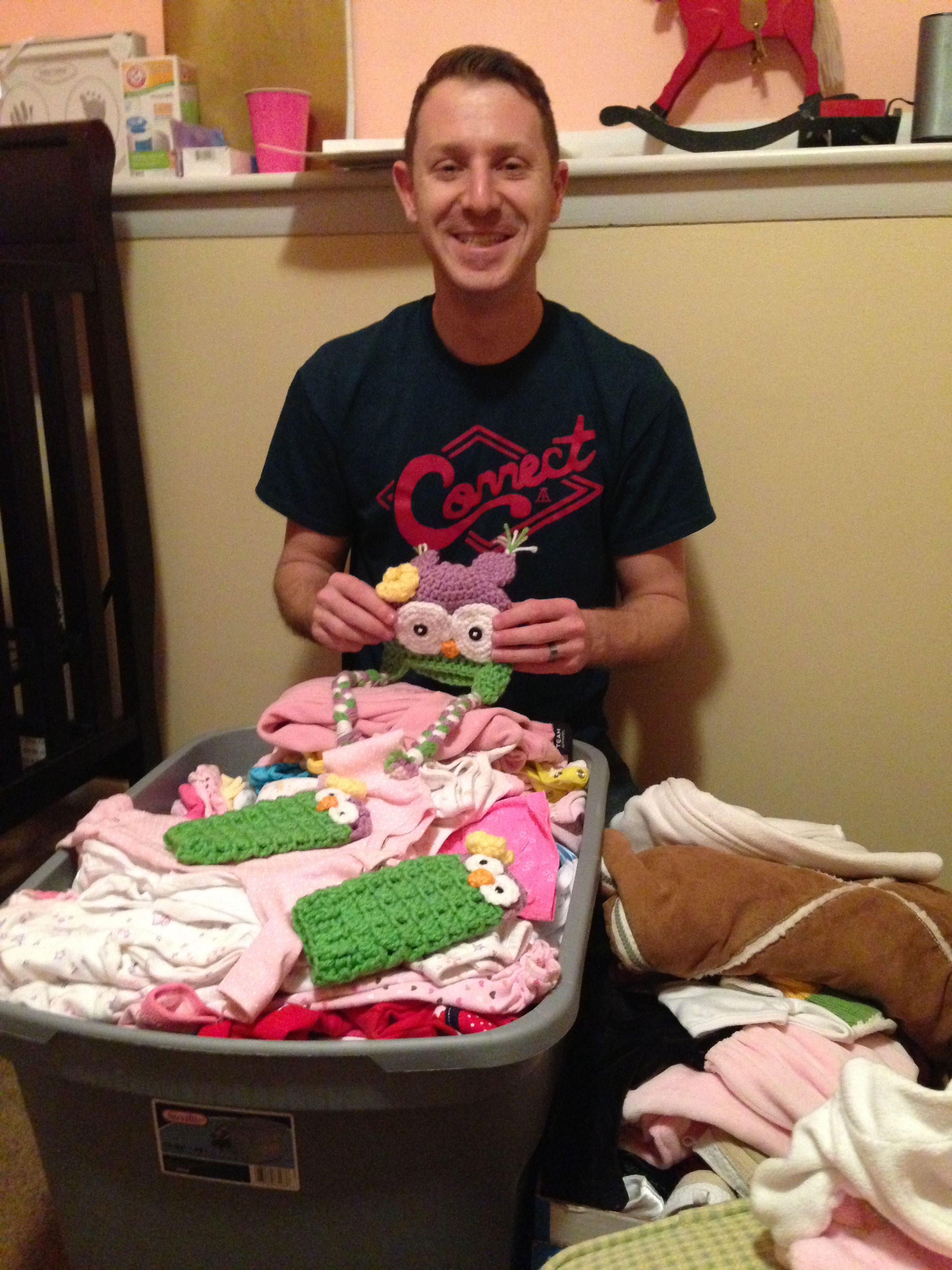 When our fantastic neighbor Ghia told us that she had some hand-me-downs from her daughter Belle, we pictured a bag with a few clothes in it. What she had was a huge storage bin and additional box of clothes. We had fun going through all the adorable clothes. It took two nights before we got through all of them! Dan loves the owl hat and as soon as her noggin is big enough, you’ll be seeing a post with her in that I’m sure.