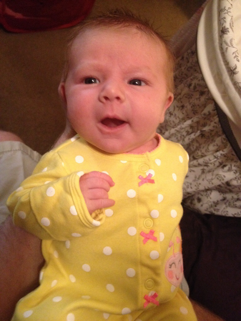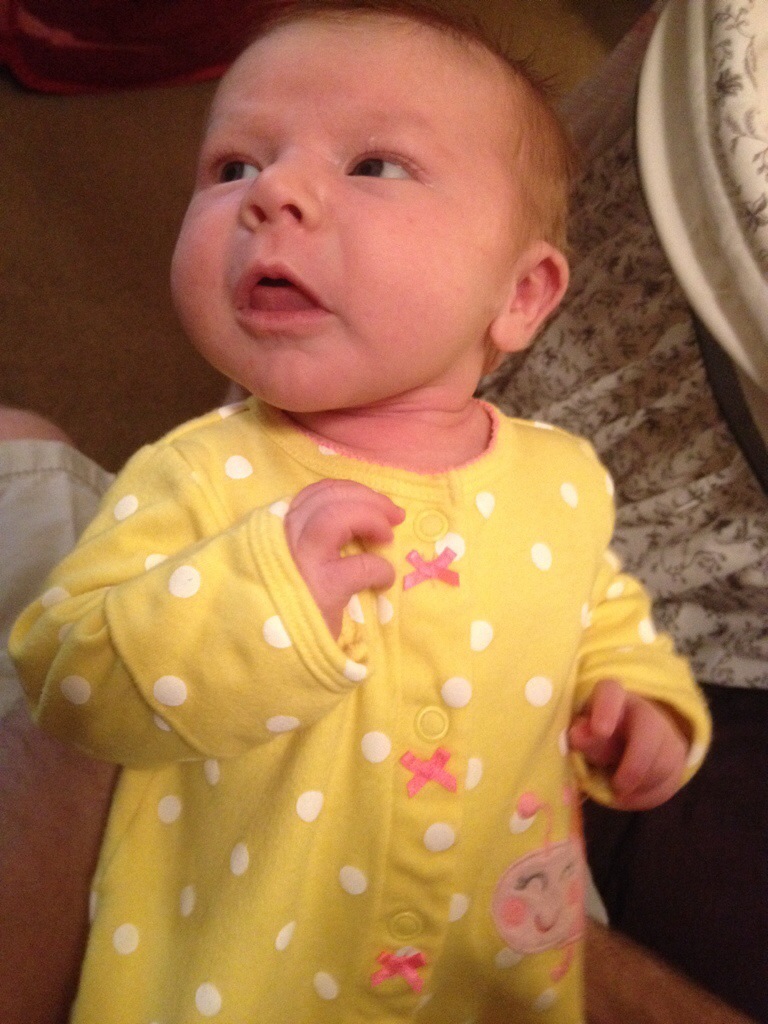 Madeline is now up to 8.1 lbs. It’s great news that she has increased weight, but the doctor would like her to continue to gain more. Her nighttime fussiness could be related to being hungry and not colic. Overall she is very healthy. She is also almost an inch bigger measuring in at 21.3″ with a 14″ head circ.