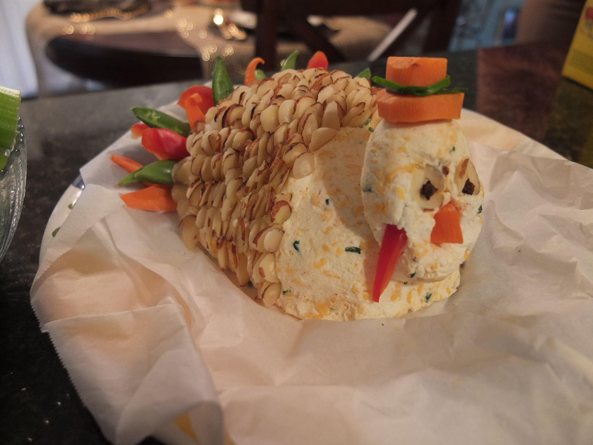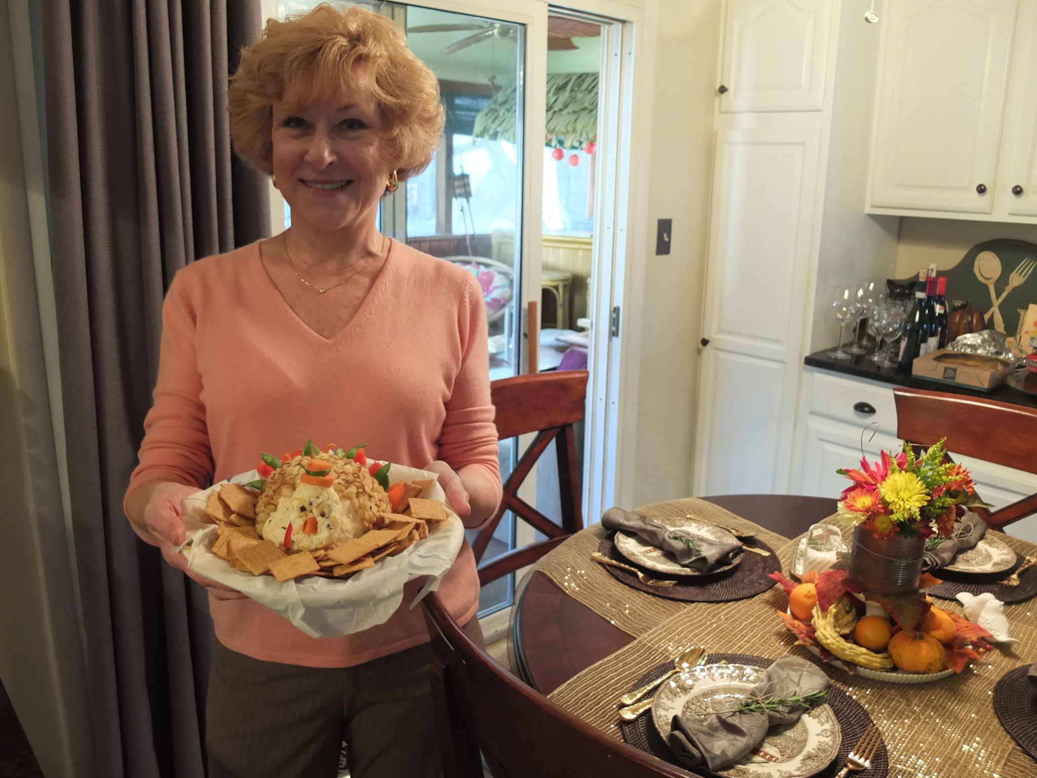 Great Aunt Karen and her Turkey. He has a top hat made out of a carrot and a chive. I can’t …..