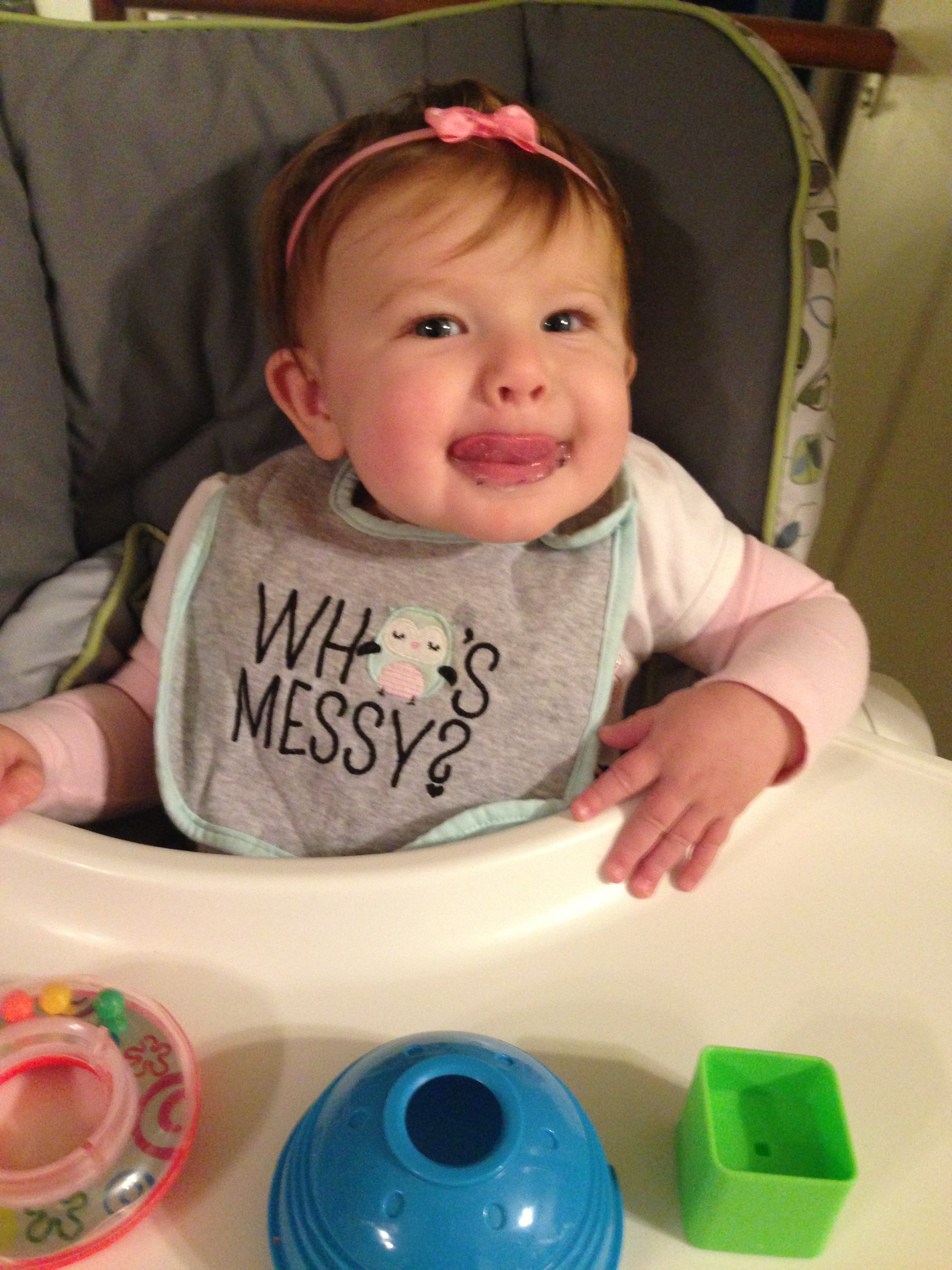 Maddie has started babbling a lot, especially during meal times. She’s making a lot of bababa noises. She’s started eating chickpeas, quinoa, mum-mum teething biscuits and puffs. She is working on getting them in her mouth herself. She loves holding a sippy cup, but is still getting the hang of drinking from it.