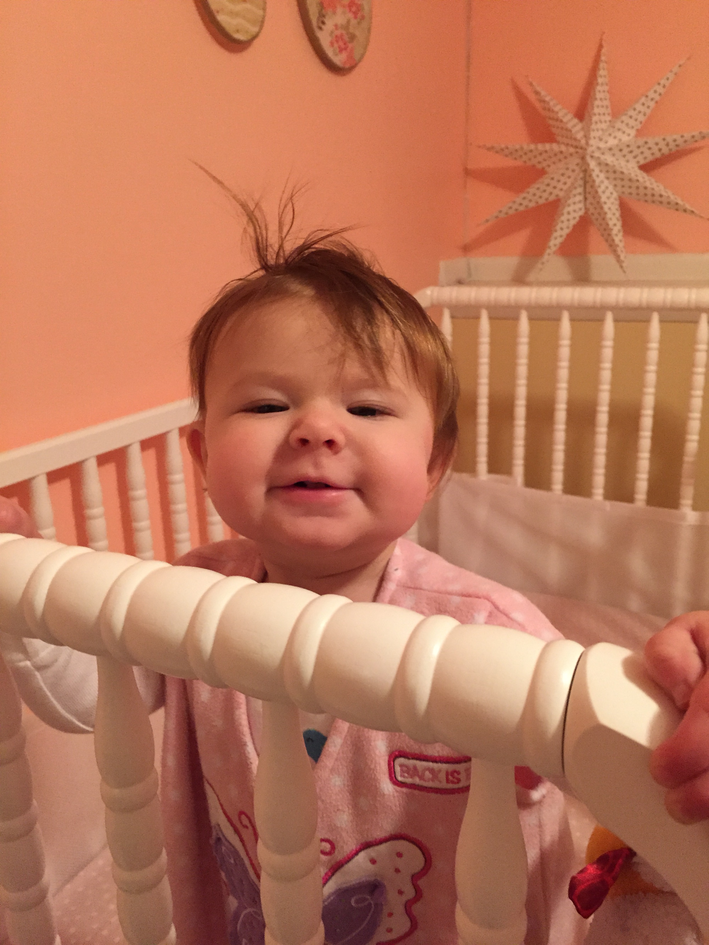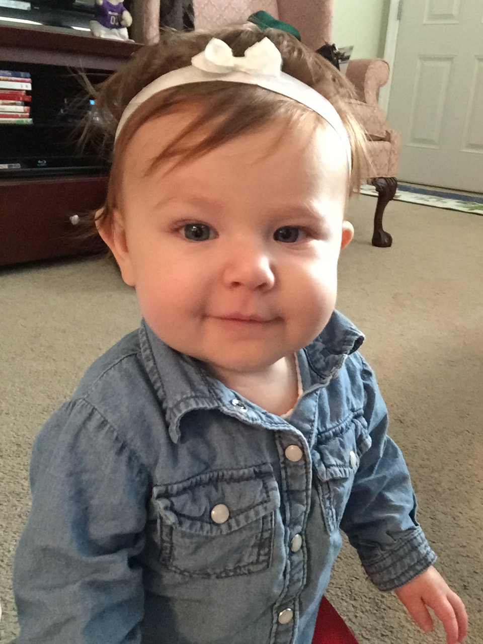 Madeline is pulling up on everything and wants to crawl up the stairs non-stop. She’s very strong and fearless. She can climb up 11 steps with someone behind her. She has also shown interest pulling up on the side of her crib. I think we might have an escape artist in the not so distant future.