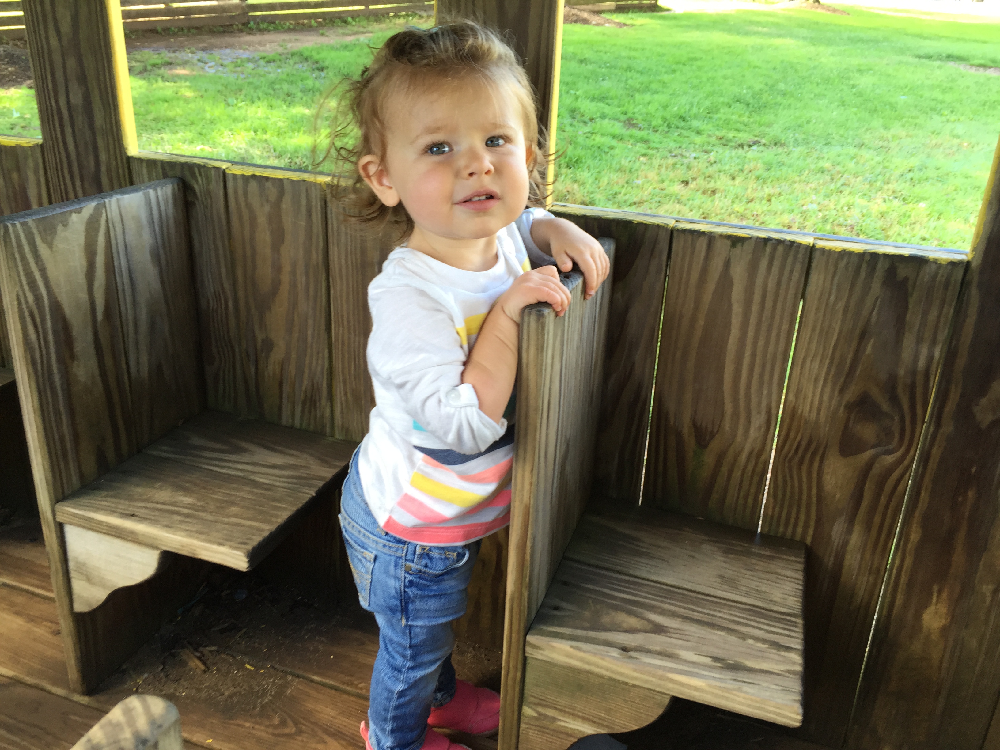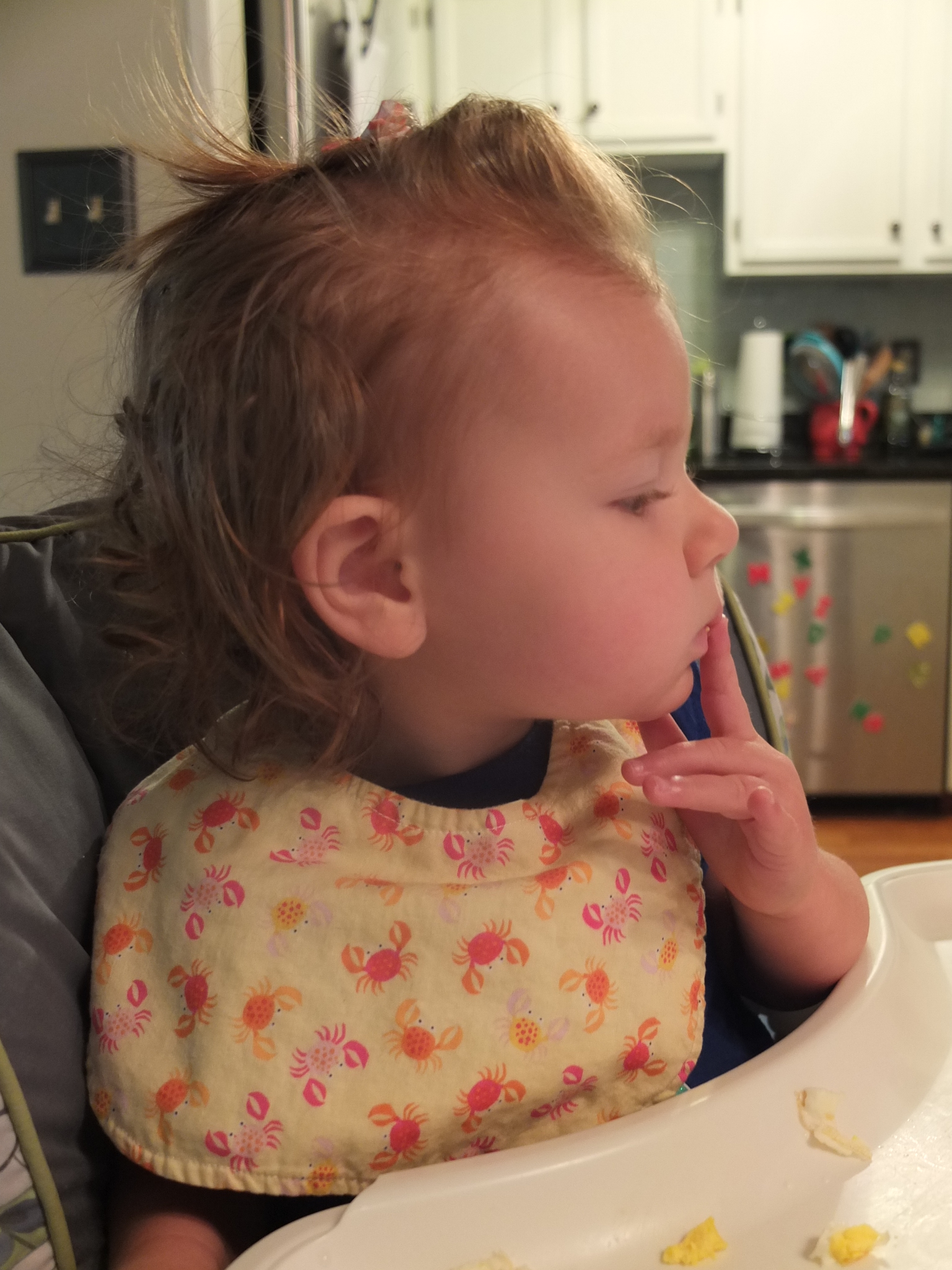Maddie is running all around now. With a blink she’s taking off. She moves quick and is more sure of herself. During walks, she will still hold your hand and she usually holds a flower or a rock in the other hand. She’s been testing her climbing skills lately as well. She’s very good sitting in her Radio Flyer red wagon and is able to independently get on and off of her little rocking chair at Grandmum’s, her Doc Mobile and Snuffy her rocking dinosaur.