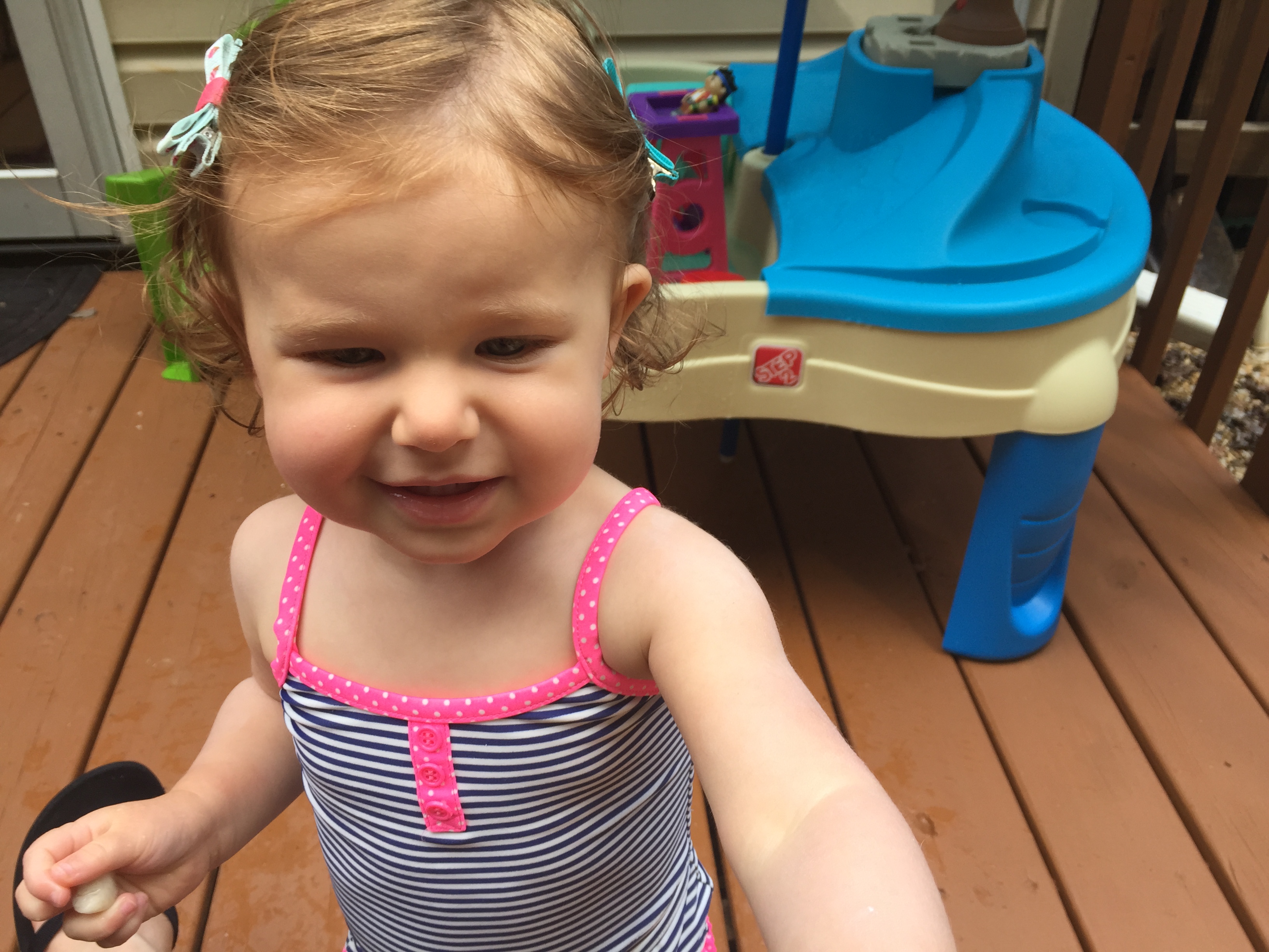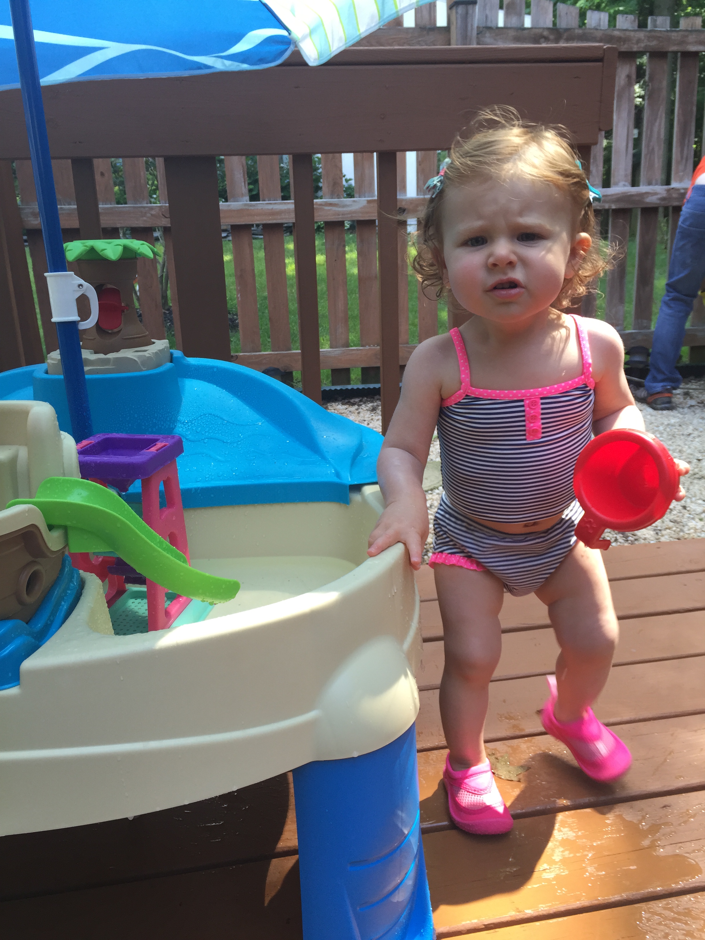 She loves swimming in her baby pool and splashing at her water table. She was a water bug in Sarah & Brian’s pool and likes trying to blow bubbles in the water. She’s learning not to swallow the water. This is a lesson we are especially enforcing in the bathtub. Ew.