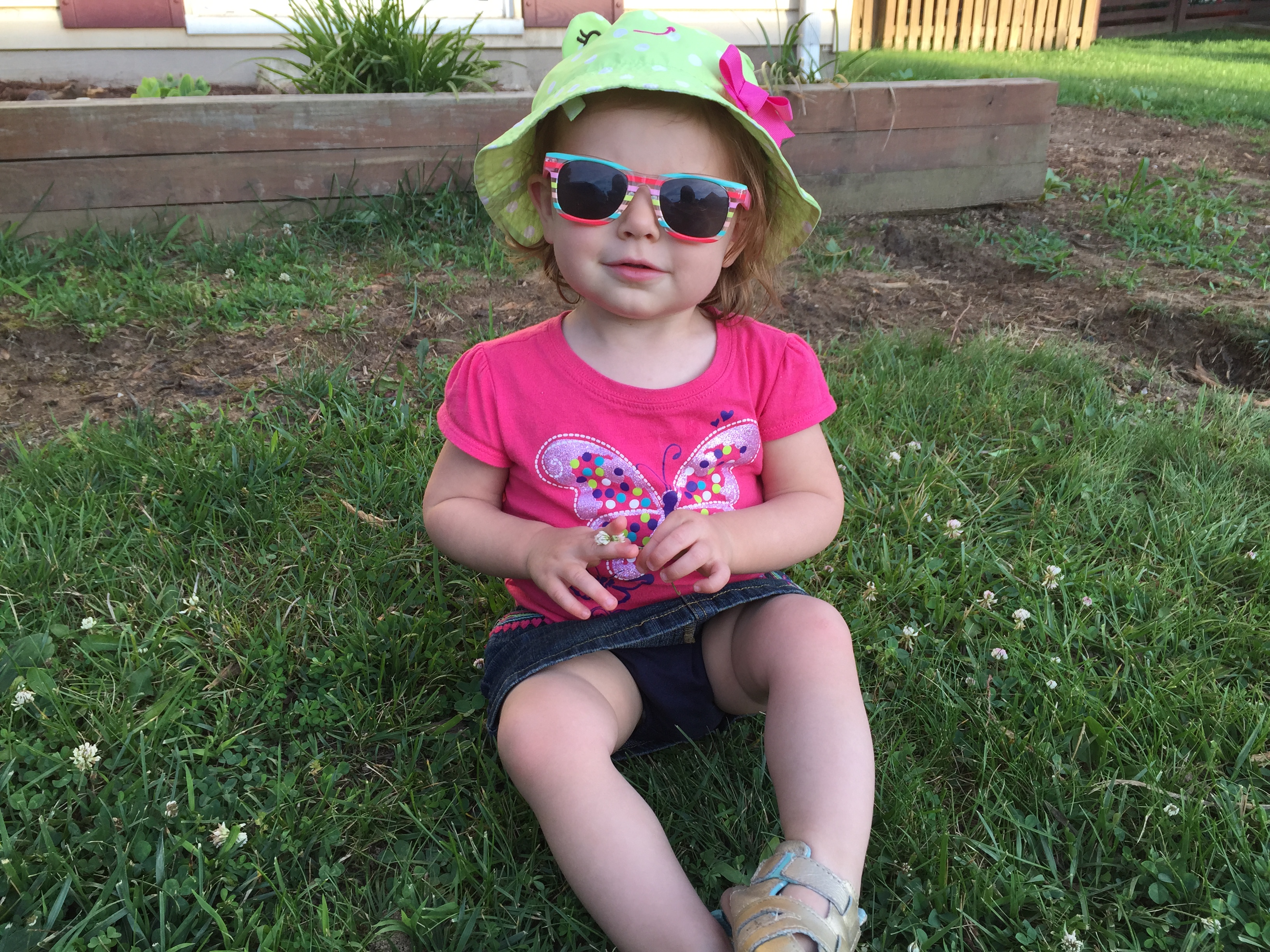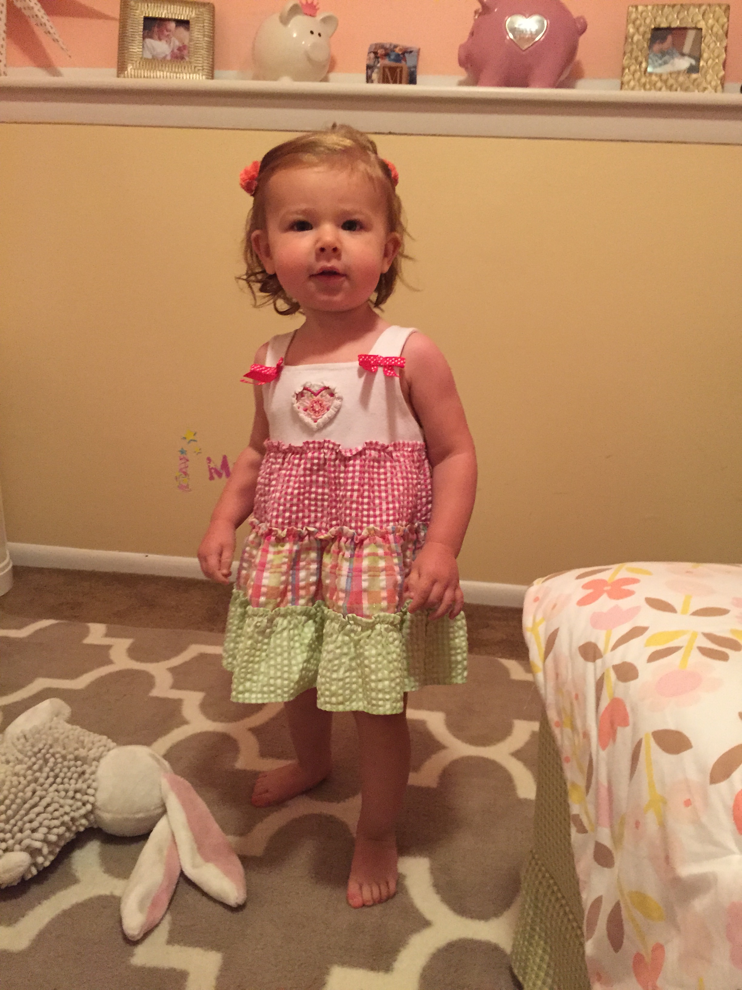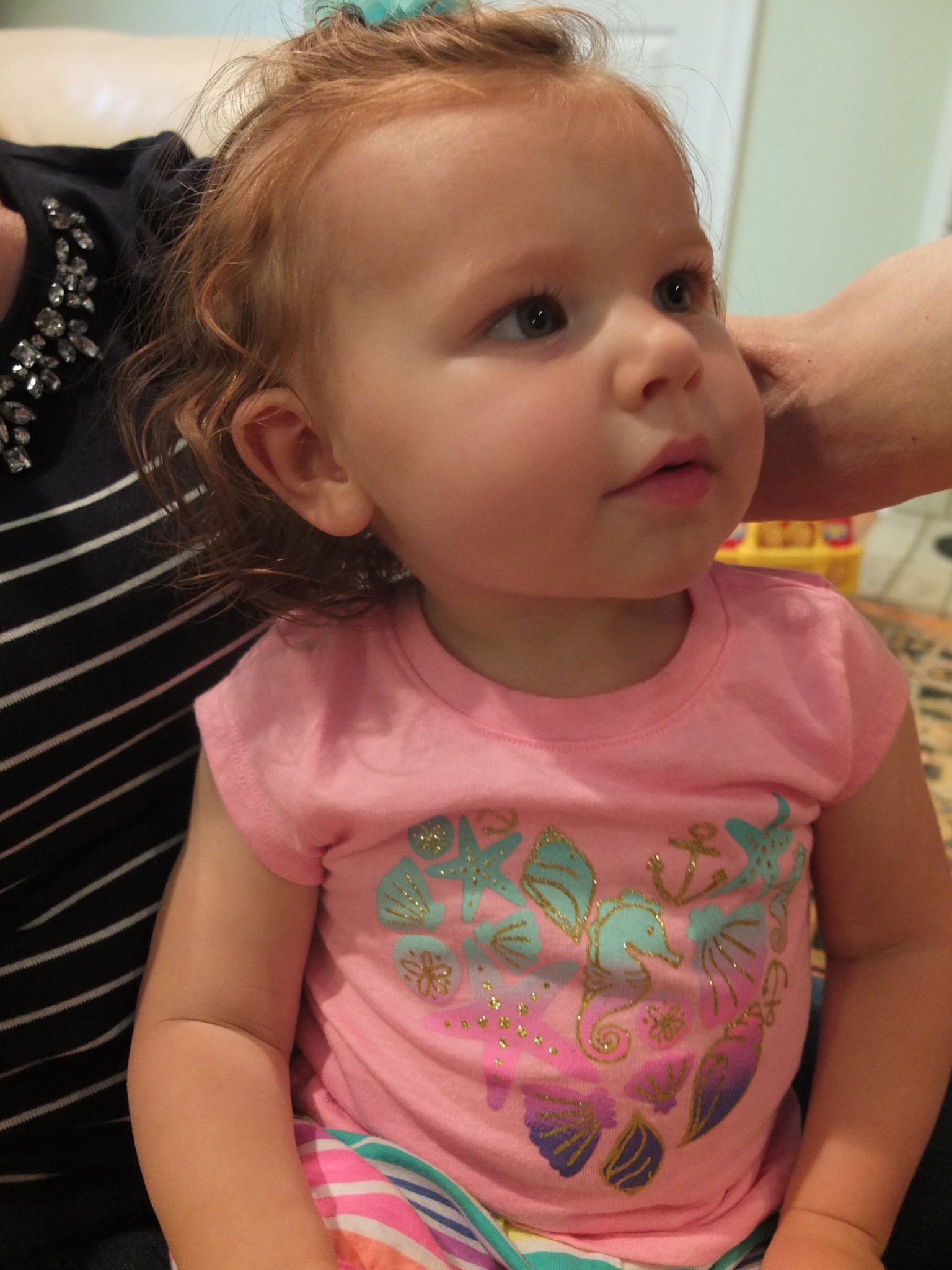 Madeline will repeat just about any word you throw at her these days. She’s been putting a few words together as well. Most notably “Humpty Dumpty”, “Let it Go” (from the movie Frozen) and “Go Away.” She tells the ants on Gaga’s porch to “go away!” She has amazed us with her memory. We have started playing a game where we will sing or read her something and leave off the last word for her to fill in. She constantly surprises us with how much she knows!