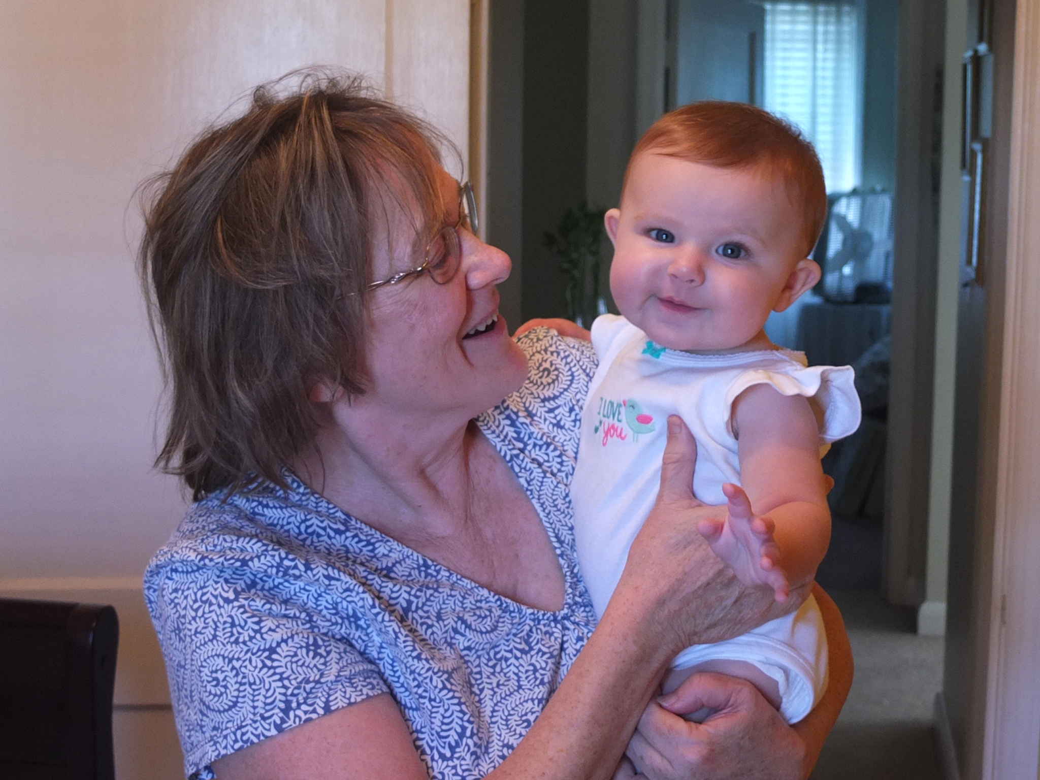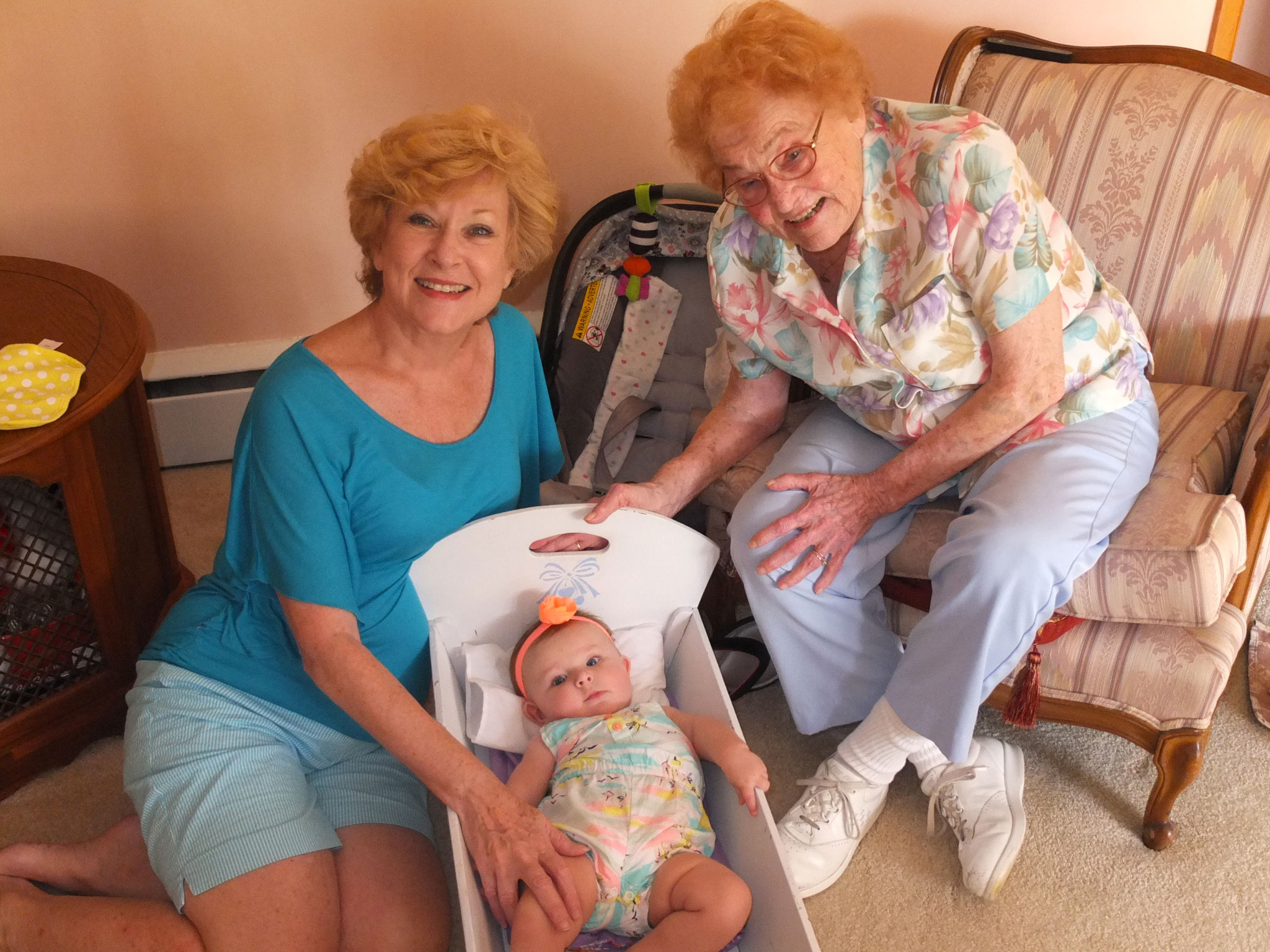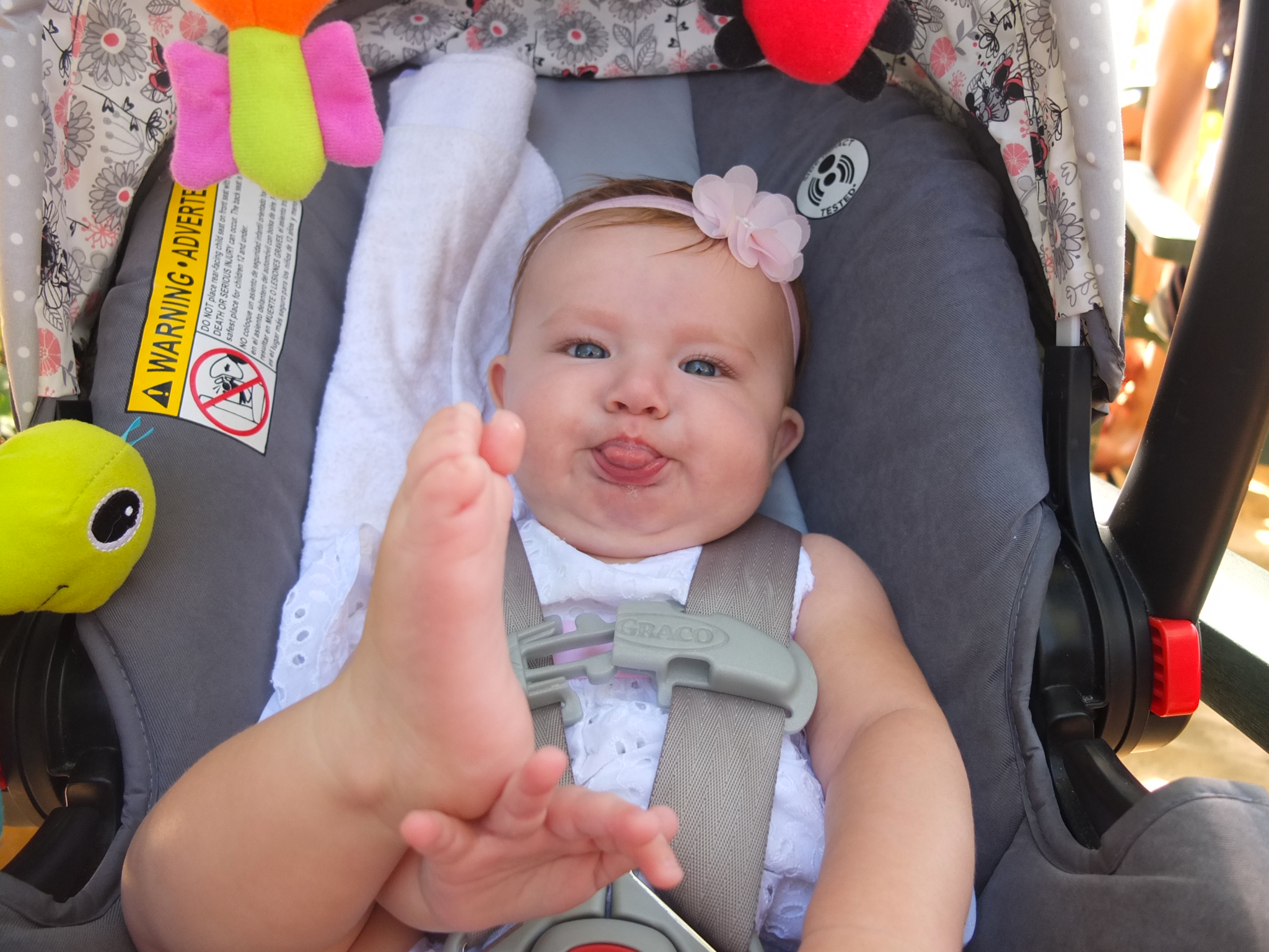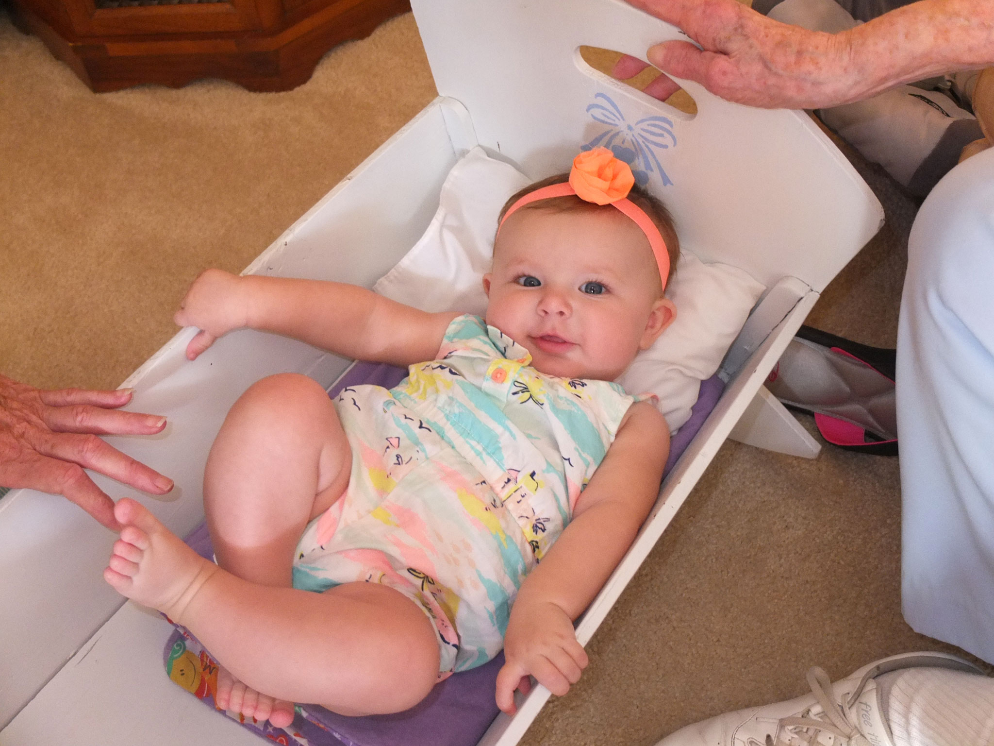 While awake, she is still moving, moving, moving. She like to stand up while being supported and is surprisingly strong. She loves sitting outside on Grandmum’s porch and enjoys waiting for the ice-cream truck lady to drive by with her music playing. She waves at Maddie 🙂 Other frequent visitors include Poppy, Mr. Lee and Mrs. Shirley and Buddy the dog. (Grandmum’s neighbors)